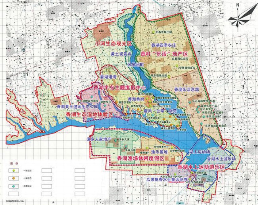 規(guī)劃采取“一心五區(qū)”的空間布局——香湖半島主題度假中心、香湖“樂活”地產(chǎn)區(qū)、香湖漁場休閑度假區(qū)、香湖水上運動游樂區(qū)、小河生態(tài)觀光區(qū)、香湖生態(tài)濕地體驗區(qū),并從主題度假、創(chuàng)意體驗和濱水娛樂三大產(chǎn)品系列描繪香湖旅游生活,再加上多入口多方式的交通組織和極富游憩體驗的接待設(shè)施安排,將關(guān)中香湖打造成名副其實的度假天堂。